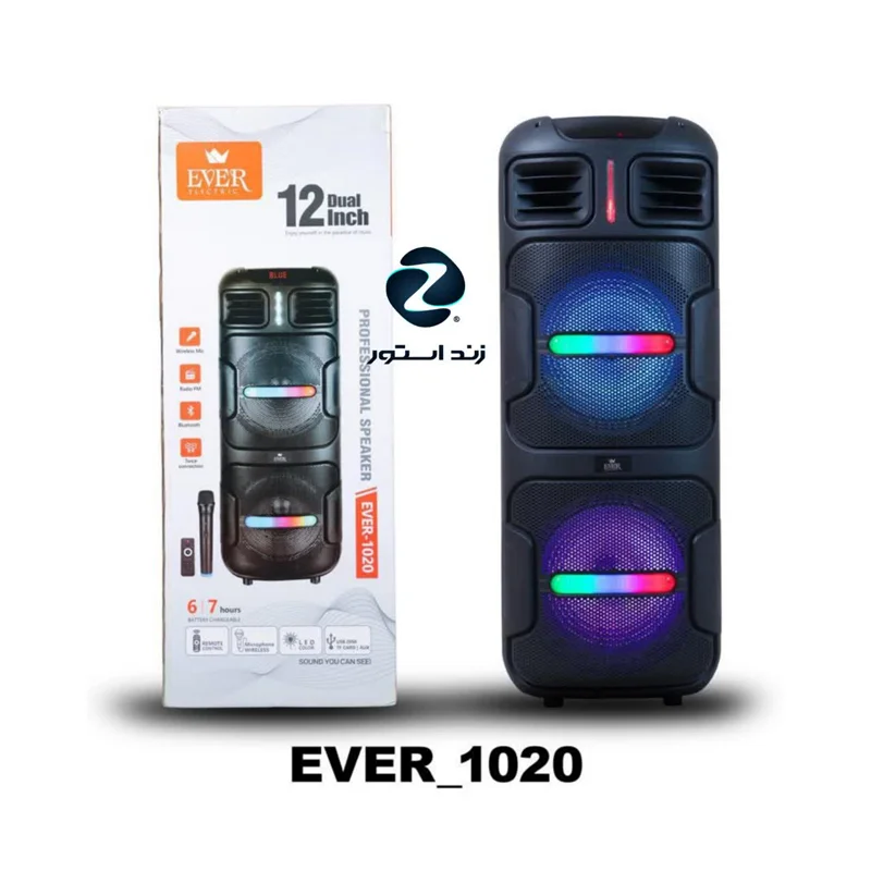 اسپیکر 1020 یک اسپیکر بسیار زیبا از نظر طراحی بهمراه کیفیت ساخت بالا از شرکت اور میباشد. .این اسپیکر از نظر امکانات و کارایی کامل میباشد و هم فلش میخورد و بلوتوث و ایوایکس و میکروفون و ... در جلو اسپیکر یک پنل تمام ال ای دی قرار دارد که جلوه های محتلف نوری ایجاد میکند که در شب نمای بسیار زیبایی دارد . سایز باند های اسپیکر 8 اینچ میباشد که میتواند جوابگو جشن های 40-50 نفر را باشد . در بالای اسپیکر یک پنل حرفه ای برای تنظیمات صدا و نور اسپیکر قرار دارد . این اسپیکر هم امکان استفاده با برق شهری و هم امکان استفاده از شارژ را داراست که استفاده از شارژ دستگاه دوام باتری ان را افزایش میدهد. این دستگاه به دلیل داشتن باتری بزرگ 9 که با آدابتور شارژ میشود و بابرق قابل استفادست. سایر ویژگی هارا در قسمت مشخصات میتونید مطالعه نمایید .